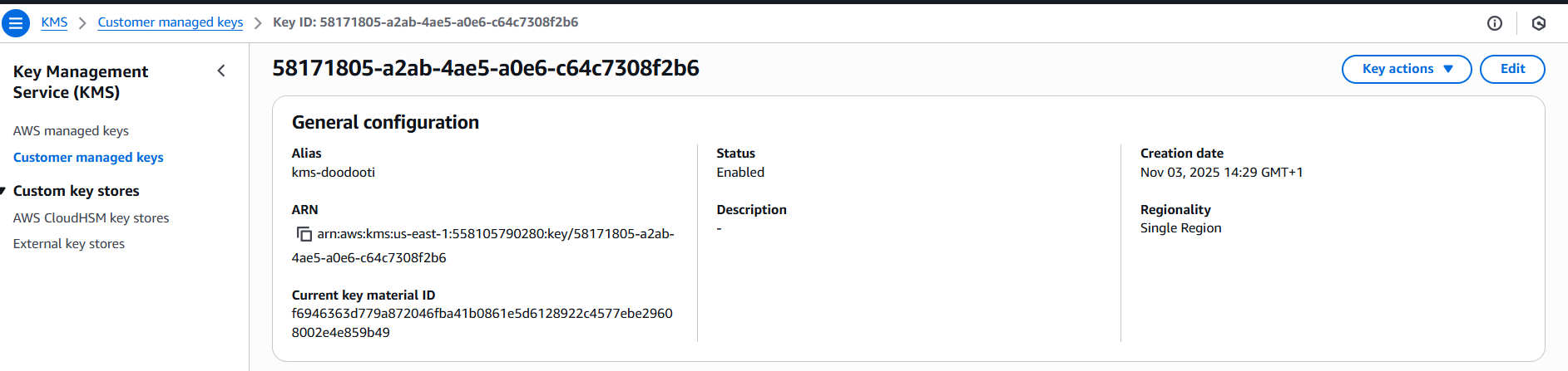 const keyId = "arn:aws:kms:us-east-1:123456789012:key/your-kms-key-id";The keyId represents the Amazon Resource Name (ARN) of the KMS key you created in the AWS Management Console, as shown in the image below.